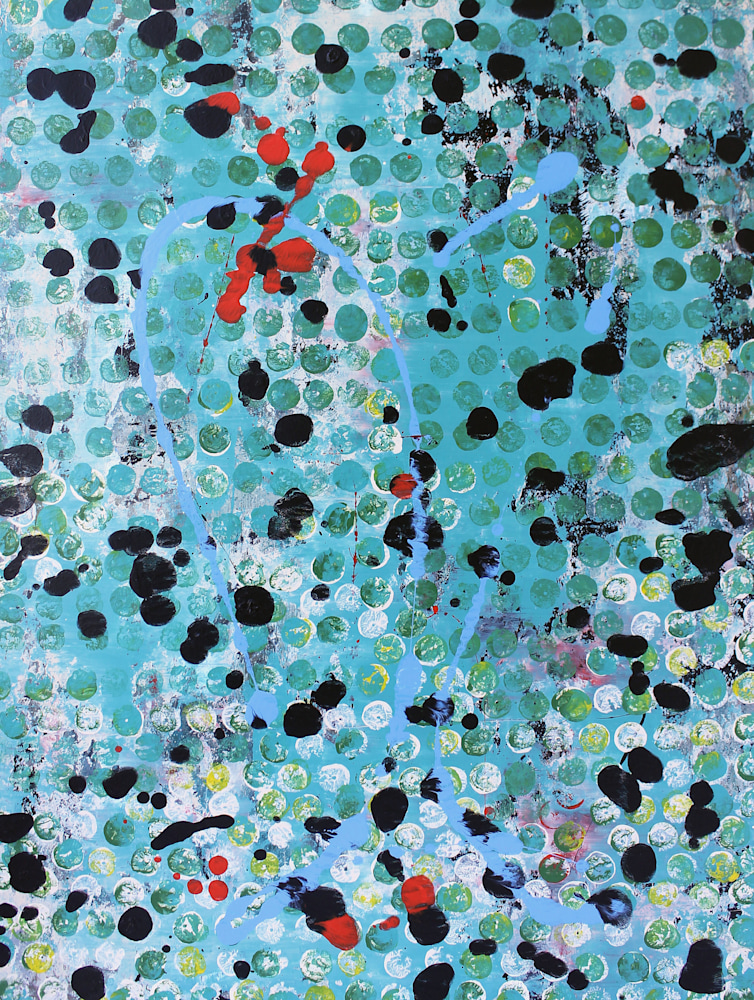 “Smoke and Mirrors” is a captivating abstract piece that plays with perception and depth. The overlapping circles in shades of blue and green, accented with black, white, red, and light blue, create a dynamic and textured background. The pattern of circles, resembling bubbles or lenses, adds a sense of mystery and illusion. The splash of red towards the upper middle part, connected by thin lines of light blue, draws the eye and adds a focal point to the composition.