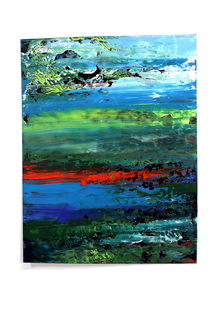 “Lakeside” beautifully captures the essence of a serene lakeside scene through an abstract lens. The vibrant blues and greens evoke the calmness of the water and the lush surroundings, while the splashes of red and white add a dynamic energy, reminiscent of sunlight reflecting off the surface. The broad brush strokes and textured layers create a sense of movement and depth, inviting viewers to immerse themselves in the tranquility and vibrancy of nature. It’s a stunning piece that feels both peaceful and full of life!