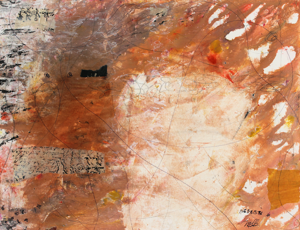 This abstract painting evokes the timeless beauty and mystery of an ancient cove. Dominant hues of warm orange, earthy brown, and pristine white create a textured backdrop that suggests age and antiquity. Black vertical lines on the left side resemble ancient pillars or trees, while the isolated black silhouette in the center-left hints at a hidden figure or artifact. Faint circular patterns in the upper central area evoke the gentle ripples of water or the passage of time. The scattered blocks of text add an element of intrigue, as if they are fragments of forgotten stories or ancient scripts. This piece invites viewers to explore its depths and uncover the secrets of a long-lost world.