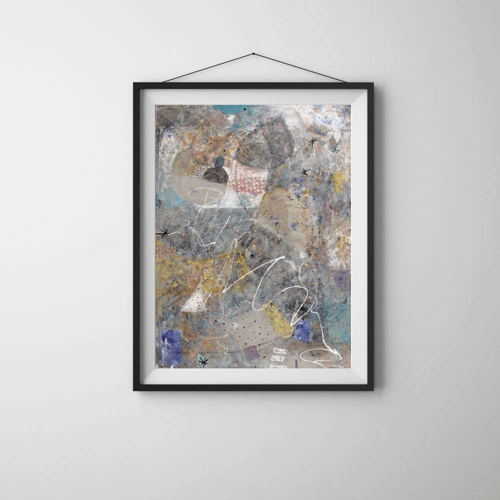 “Wide Open” is an abstract exploration of freedom and expansiveness. The painting features dynamic scribbled white lines, black star-like figures, and vibrant patches of blue, yellow, and pink. The lace-like textures add depth, inviting viewers to immerse themselves in the boundless energy and open possibilities of the composition.