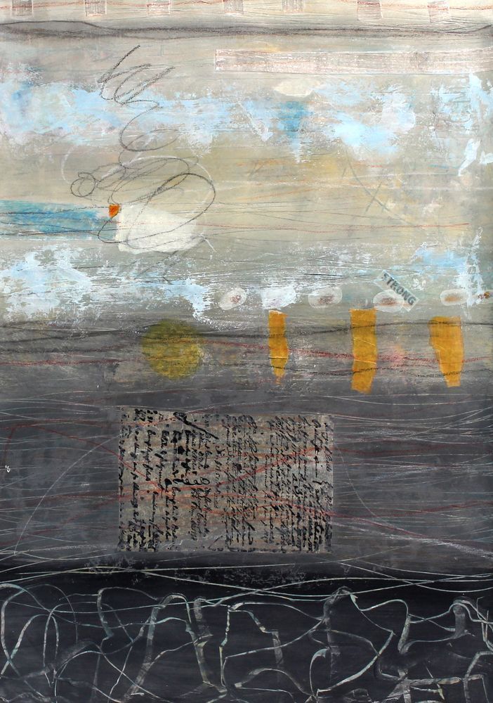 “Unspoken” is an evocative abstract painting that captures the complexity of communication and the nuances of unexpressed thoughts. The artwork features a light blue sky-like section at the top, with faint scribbles and a small orange dot, possibly symbolizing the sun. Below this, five vertical objects in orange and yellow tones resemble candles or crayons, standing above a dark horizontal band.