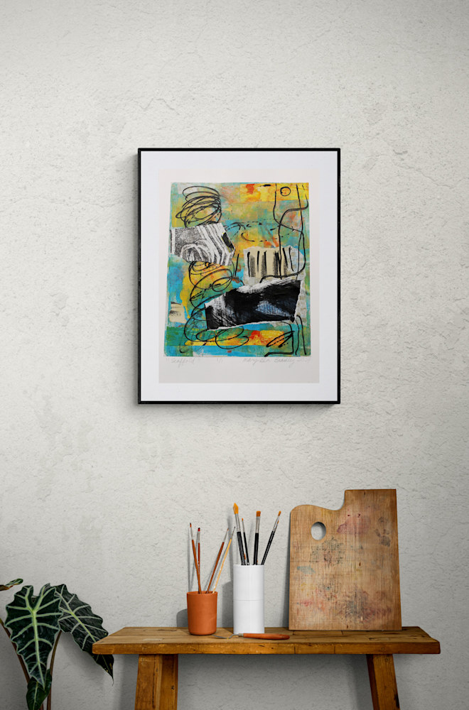 Immerse your space in the dynamic energy of "Scaffold." This vibrant abstract piece combines textured layers with swirling shapes, creating a mesmerizing interplay of form and color. Each segment showcases a collage of elements that invites exploration, revealing various artistic nuances with every glance.