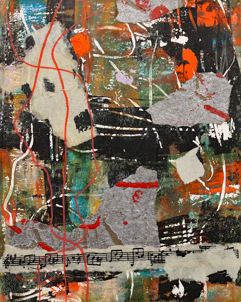 "Urban Rhythms" presents a vibrant and chaotic tapestry of colors and textures, evoking the dynamic pulse of city life. The canvas is a rich collage of abstract forms and lines, with layers of paint creating depth and complexity. Bold streaks of red and white cut through the composition, reminiscent of traffic lines or neon lights, while stenciled elements suggest architectural features or urban motifs. The interplay of opaque and translucent sections adds to the visual intrigue, making “Urban Rhythms” a captivating representation of metropolitan energy.