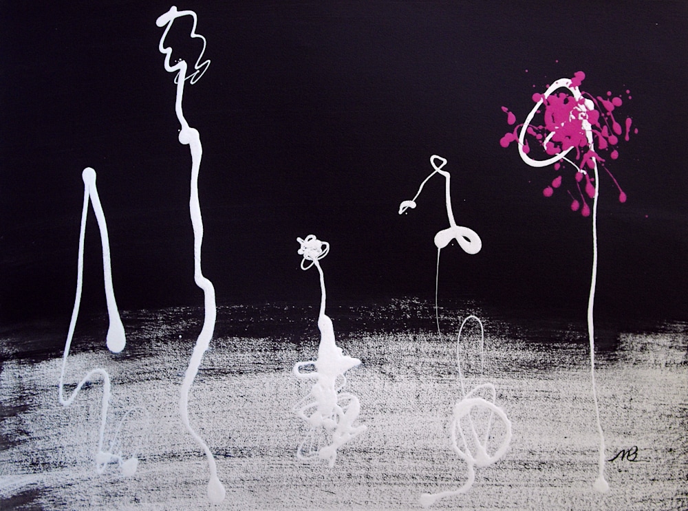 “Magenta” is a captivating abstract piece that masterfully uses contrast and color to create a dynamic visual experience. The black background sets a dramatic stage for the white and magenta elements. The elongated, white figures evoke a sense of organic growth, reminiscent of stylized plants or natural forms. The bold splash of magenta on the right side, with its dripping effect, adds a sense of movement and energy, making the composition feel alive and vibrant.