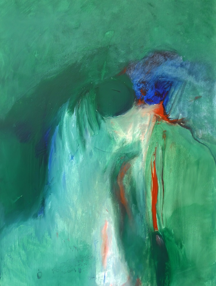"Hidden Falls", beautifully captures an abstract scene with a blend of vibrant and muted colors. The dominant green hues suggest a natural setting, while the central white form cascading downward evokes the image of a waterfall. The accents of blue and orange add depth and contrast, enhancing the overall composition. The soft, blended brushstrokes create a sense of harmony and tranquility, making you feel as if you are discovering a hidden gem within nature.