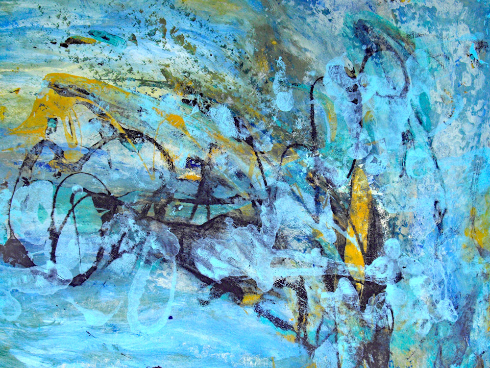 “Summer Storm” captures the raw energy and vibrant chaos of a sudden summer tempest. Swirling patterns of deep blues and bright yellows clash and merge, evoking the tumultuous dance of storm clouds and sunlight. The dynamic composition, with its splashes of white, suggests the fierce winds and rain, while the warmer tones hint at the underlying heat of the season. This piece beautifully balances the intensity of a storm with the warmth of summer, creating a visually striking and emotionally evocative work.