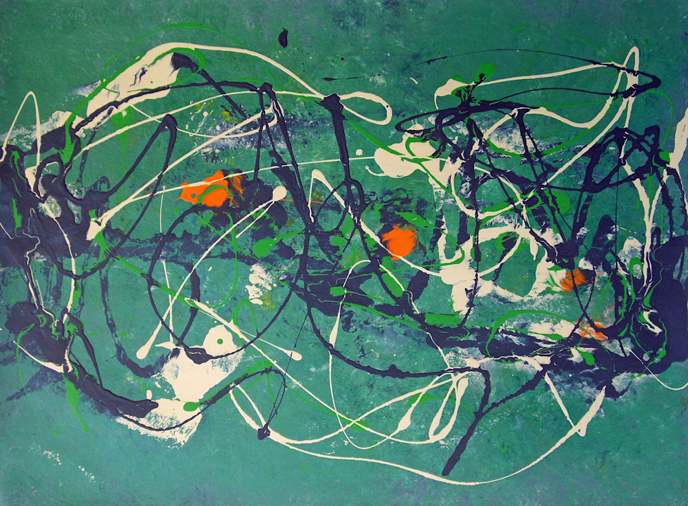 "Belmont Park" captures the dynamic energy and vibrant atmosphere of a bustling amusement park. The artwork features a chaotic tangle of black and white lines and splatters, set against a lively green background. Accents of orange and yellow add a playful touch, reminiscent of the colorful rides and attractions. The composition’s energetic movement and contrasting colors evoke the excitement and joy of a day spent at the park, filled with laughter and adventure.