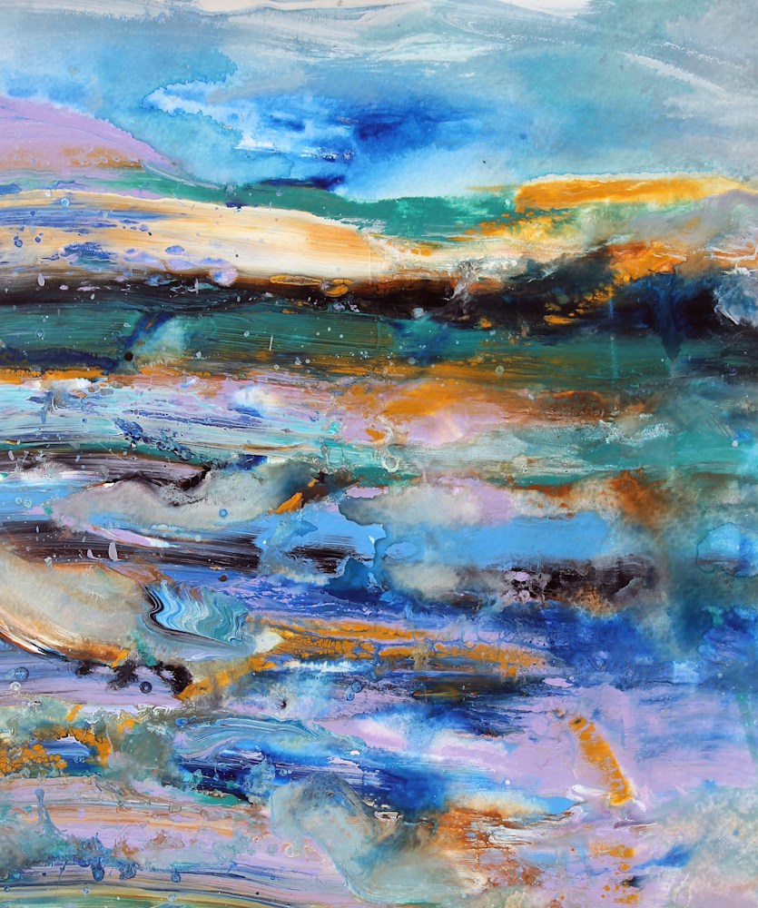 “Molokai” beautifully captures the essence of an abstract landscape with its vibrant and dynamic color palette. The layers of blue and turquoise evoke the serene waters surrounding the island, while the splashes of yellow and orange bring to mind the warmth of the sun and the lush tropical environment. The broad strokes and fluid movement in the painting create a sense of depth and energy, inviting viewers to immerse themselves in the tranquil yet lively atmosphere of Molokai.