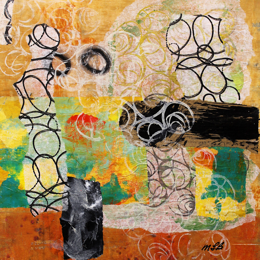 "Birdsong” captures the essence of nature's melody in a riot of color and form. Delicate circles, reminiscent of musical notes, pirouette across a landscape of burnt orange, bright green, and sunny yellow hues. Splashes of red punctuate the composition, drawing the eye amidst black shapes that lend a focal point to the symphony of movement and color."
