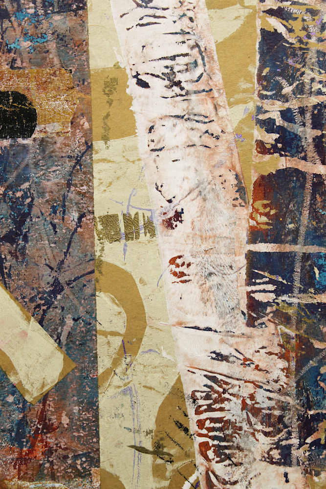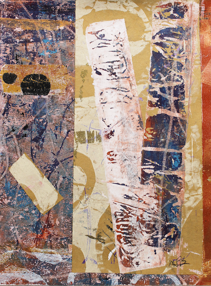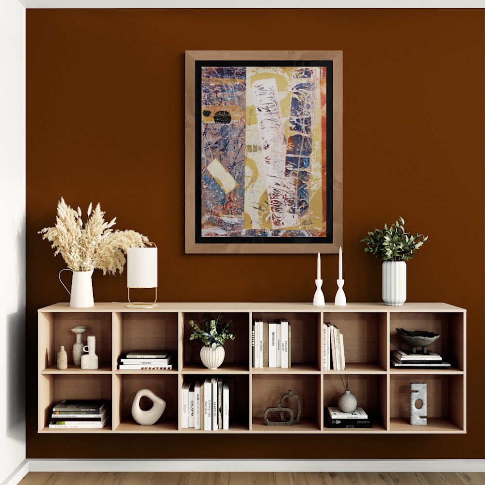 Echoes of Earth captures the essence of nature’s raw beauty through a rich tapestry of textures and colors. Layers of paint create a dynamic surface, with visible brush strokes and splotches adding depth and movement. The composition features a variety of shapes, including rectangles and circles, some with clear boundaries while others blend seamlessly into the background. The earthy color palette, accented with hints of blue, red, and white, brings vibrancy and life to the piece. The use of paper adds a three-dimensional aspect, enhancing the tactile quality of the work. This artwork invites you to explore its intricate details and the sense of depth created by the overlapping materials and colors.