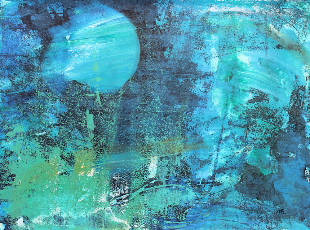 "Moonrise" has captivating, ethereal beauty. A celestial sphere in sky blue dominates the painting. The textured background, a tapestry of deep sapphire and black, creates a cosmic depth. Intriguing jade green and topaz accents dance across the surface, adding a mesmerizing touch. The quiet magic of a moonrise, rendered in hues that evoke the mysteries of the night sky.