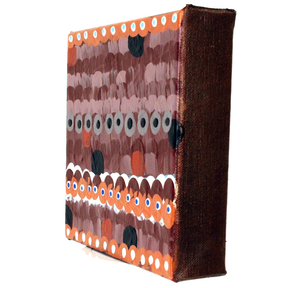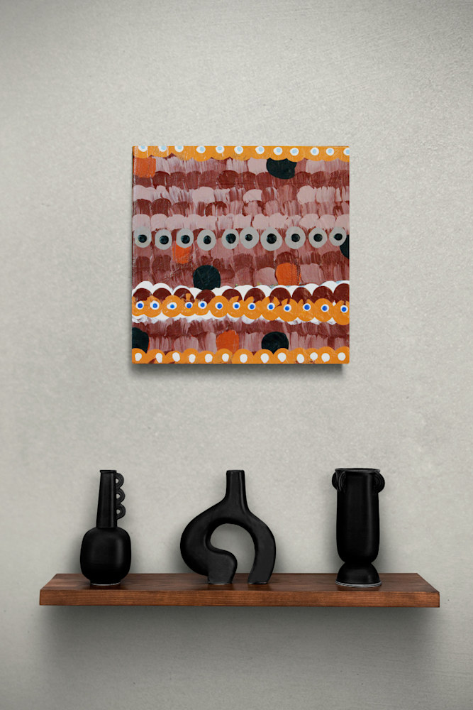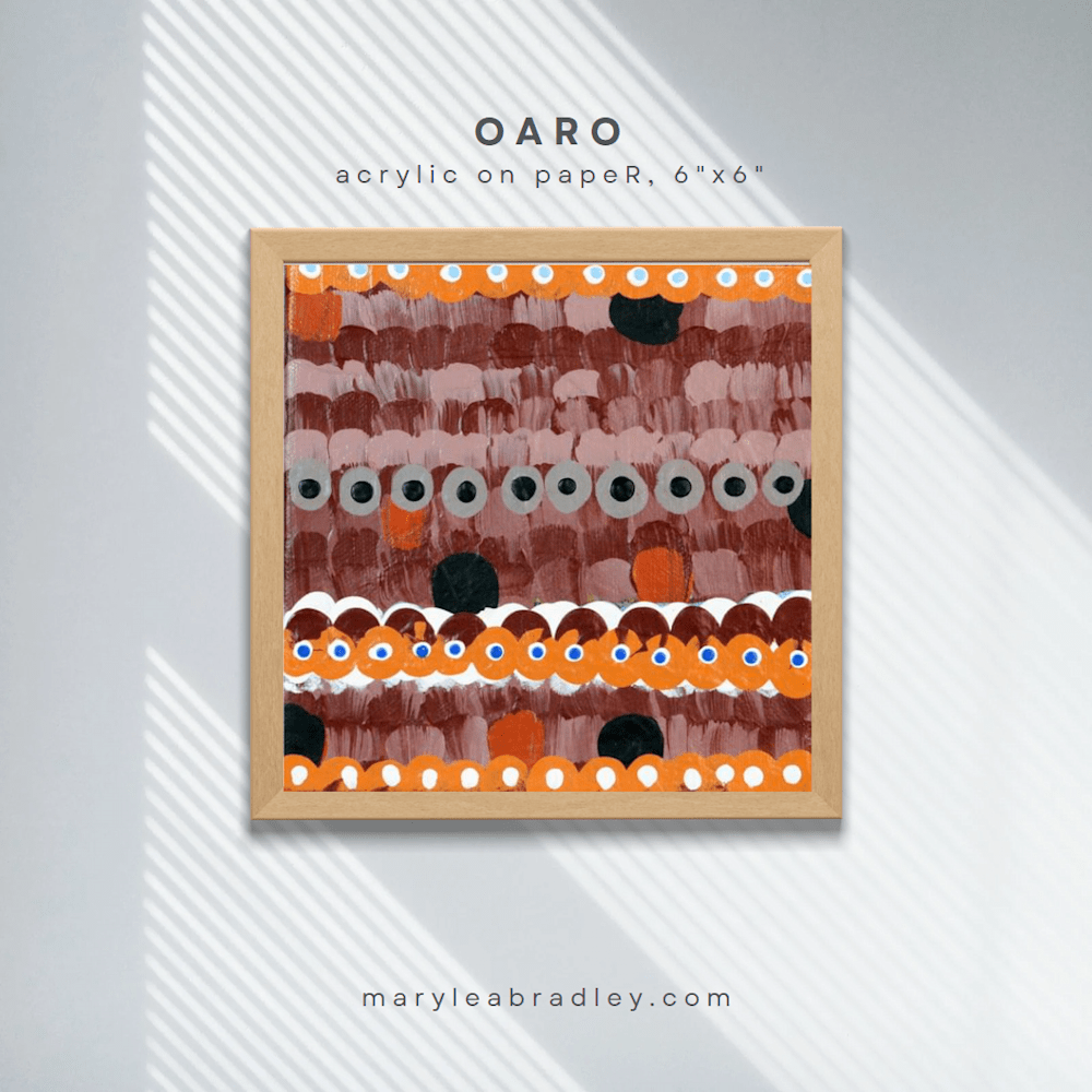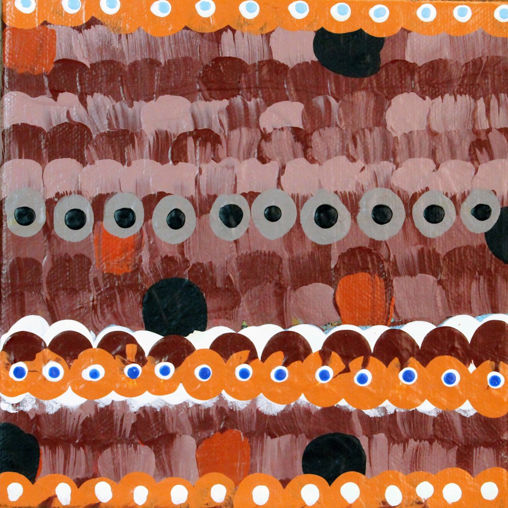 “Oaro” is a captivating abstract composition that draws the viewer in with its vibrant interplay of colors and shapes. The artwork features multiple rows of painted circles and dots in various sizes, predominantly in shades of orange, white, and black. Some circles have smaller black circles within them, resembling eyes, adding a sense of depth and intrigue.