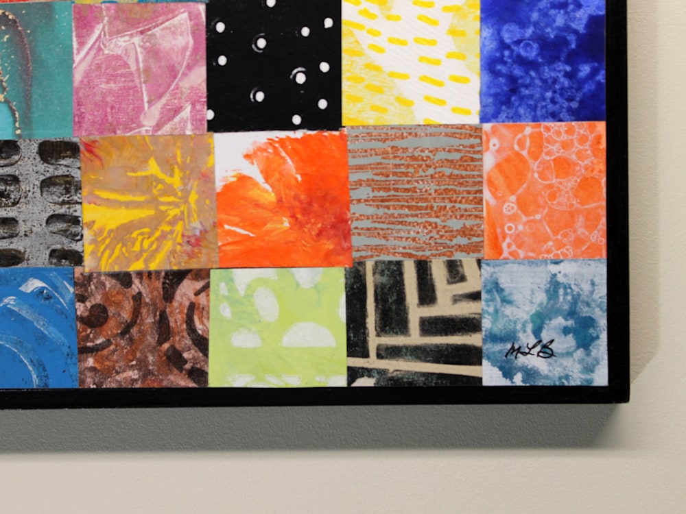 This captivating series of four 12x12 inch wood panels, each adorned with a faux frame, showcases a vibrant mosaic of unique squares. Every square tells its own story through a diverse array of patterns, textures, and colors. From abstract designs and floral motifs to geometric shapes and animal prints, the eclectic mix creates a dynamic visual experience. The bright oranges, yellows, deep blues, greens, and touches of pink and purple harmonize beautifully, making each piece a delightful exploration of color and form.