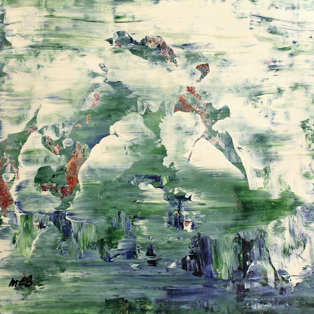 “Sierra Peak” captures the rugged beauty and dynamic essence of a mountainous landscape. The painting is a vibrant interplay of greens and whites, with touches of red and brown that evoke the rocky terrain and lush vegetation. The brushstrokes are bold and textured, suggesting the natural chaos and movement of the wilderness. This piece feels alive, as if the mountains themselves are breathing and shifting under the viewer’s gaze. The signature “m08” in the corner adds a personal touch, grounding the abstract elements in the artist’s unique vision.