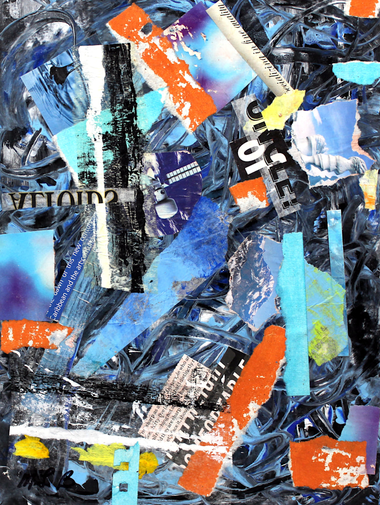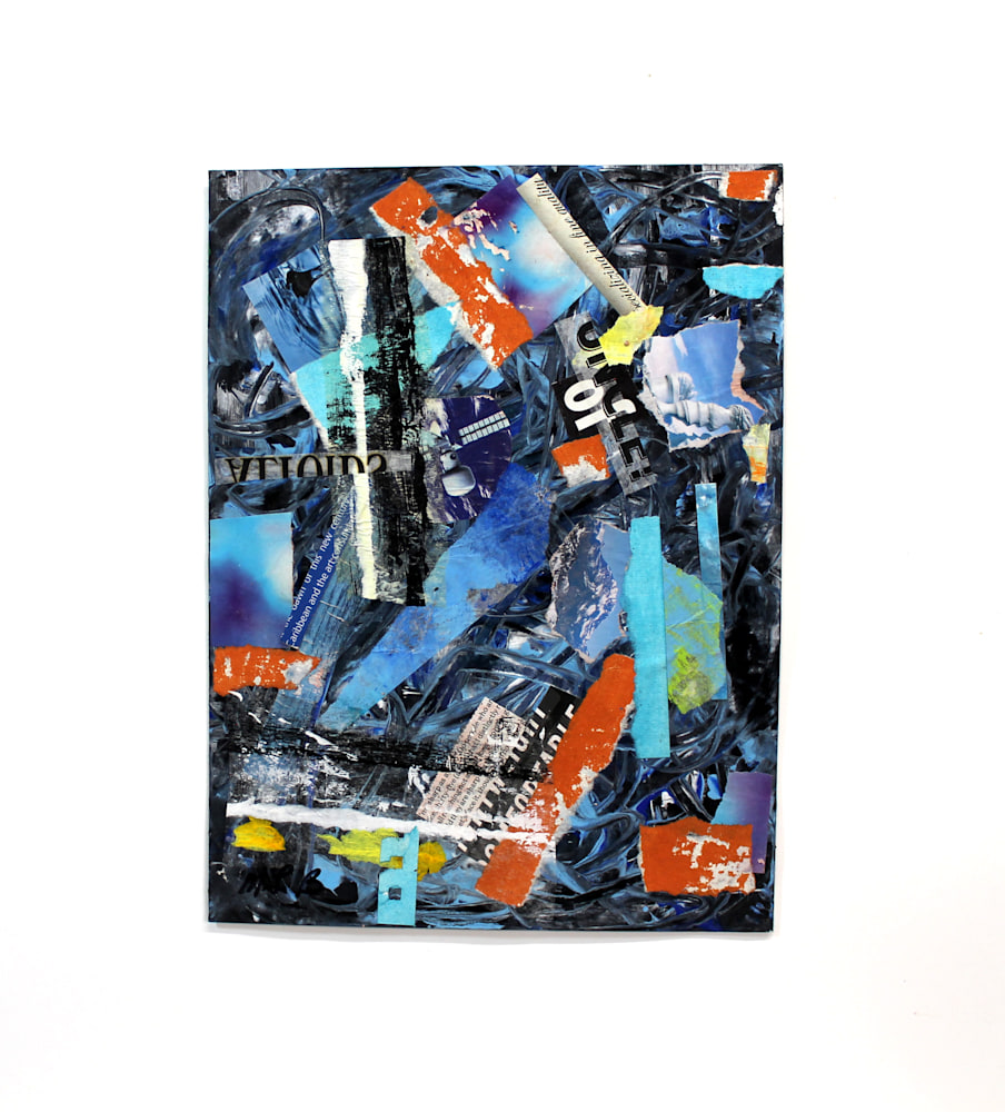 “Urban Blue” is a vibrant collage that captures the essence of city life through a dominant blue palette. The artwork features a chaotic yet harmonious layering of cut-out pieces, including text, patterns, and blocks of color. Hints of orange, yellow, and white add contrast and depth, making the composition visually striking. The overlapping elements and varied materials evoke the dynamic and multifaceted nature of urban environments.
