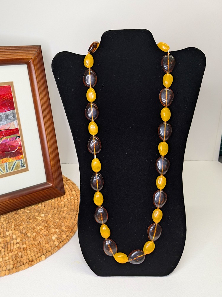 Warm and earthy, this vintage necklace features a 30-inch strand of alternating oval beads in translucent amber-look and opaque yellow tones. The amber-style beads have internal striations that mimic natural resin, while the yellow beads offer a smooth, matte contrast. Barrel clasp — slips easily over the head for effortless wear. • Length: Approx. 30" • Materials: Faux amber resin and opaque acrylic/plastic • Condition: Excellent vintage condition • Style: Barrel closure • Era: Likely 1970s–1980s A beautiful accessory for lovers of boho, Southwestern, or mid-century style. Great for layering or as a standalone statement.